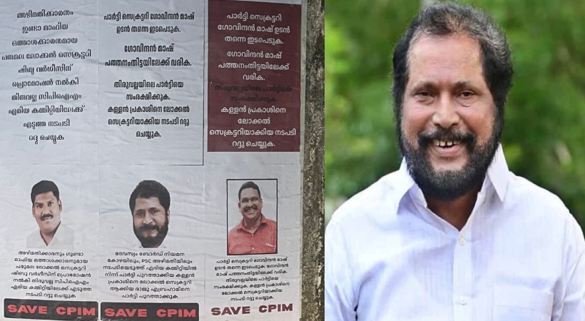അഴിമതി ആരോപണങ്ങളിൽ നടപടി നേരിട്ട് തരംതാഴ്ത്തപ്പെട്ട പ്രകാശ് ബാബുവിന് സ്ഥാനക്കയറ്റം നൽകാൻ തീരുമാനിച്ചതിന് പിന്നാലെ തിരുവല്ലയിൽ സിപിഐഎം ജില്ലാ സെക്രട്ടറിക്കെതിരെ പോസ്റ്ററുകൾ. പത്തനംതിട്ട ജില്ലാ സെക്രട്ടറി രാജു എബ്രഹാമിനെതിരെയാണ് വ്യാപകമായി പോസ്റ്ററുകൾ പതിച്ചിരിക്കുന്നത്.പ്രകാശ് ബാബുവിനെ ലോക്കൽ സെക്രട്ടറിയാക്കിയ നടപടി റദ്ദ് ചെയ്യണമെന്നും വിവാദമായ ഈ തീരുമാനമെടുത്ത രാജു എബ്രഹാമിനെ പാർട്ടിയിൽ നിന്ന് പുറത്താക്കണമെന്നുമാണ് പോസ്റ്ററിലെ ആവശ്യം. സിപിഐഎം സംസ്ഥാന സെക്രട്ടറി ഇടപെടണമെന്നും സേവ് സിപിഎമ്മിന്റെ പേരിൽ പതിച്ച പോസ്റ്ററിൽ ഉണ്ട്. ദേവസ്വം ബോർഡ് നിയമന നടപടിയിൽ ഉൾപ്പെടെ നടപടി നേരിട്ട് ഏരിയ കമ്മിറ്റിയിൽ നിന്ന് ബ്രാഞ്ച് കമ്മിറ്റിയിലേക്ക് തരംതാഴ്ത്തപ്പെട്ട പ്രകാശ് ബാബുവിനെ തിരുവല്ല ടൗൺ നോർത്ത് ലോക്കൽ സെക്രട്ടറിയാക്കാനായിരുന്നു തീരുമാനം.