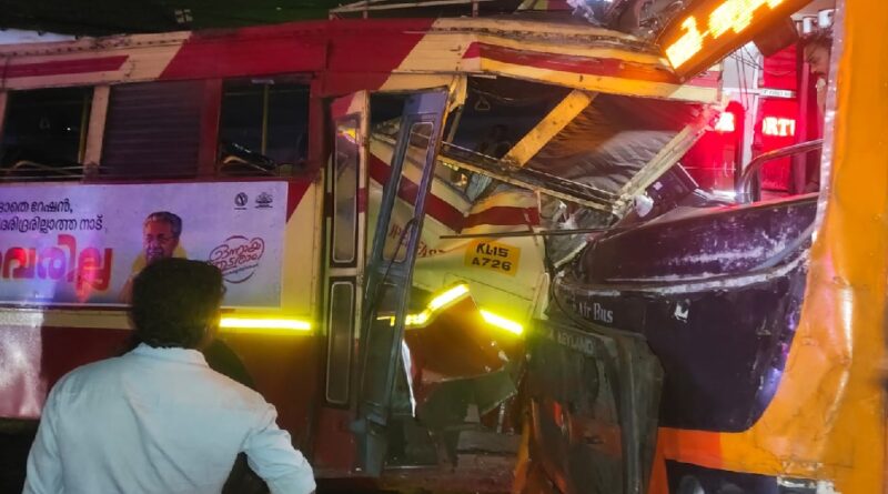ഇന്നലെ രാത്രി പത്തരയോടെയായിരുന്നു അപകടം. കോഴിക്കോട്-തിരുവനന്തപുരം സ്വിഫ്റ്റ് സൂപ്പർഫാസ്റ്റ് ബസും കോഴിക്കോട്-ചെങ്ങന്നൂർ സൂപ്പർഫാസ്റ്റ് ബസുമാണ് കൂട്ടിയിടിച്ചത്. പരിക്കേറ്റവരെ അടുത്തുള്ള സ്വകാര്യ ആശുപത്രിയിലേക്കും താലൂക്ക് ആശുപത്രിയിലേക്കും മാറ്റി. ആരുടെയും പരിക്ക് ഗുരുതരമല്ല.
