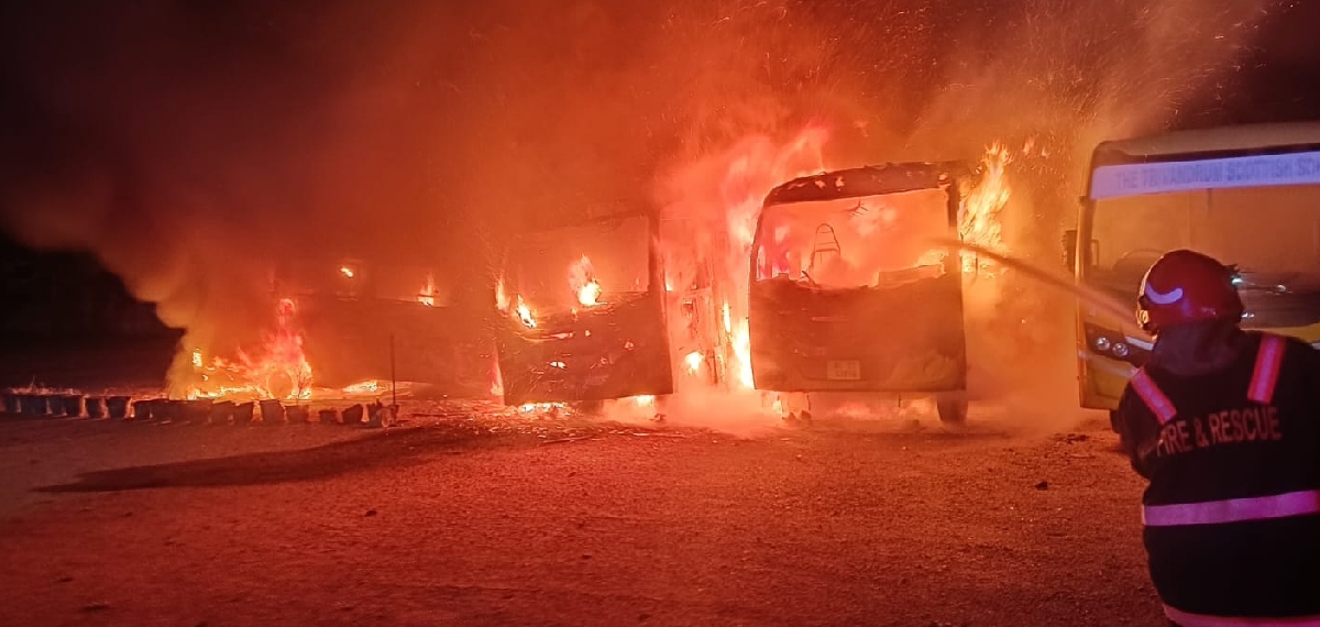തിരുവനന്തപുരം ട്രിവാന്‍ഡ്രം സ്‌കോട്ടിഷ് സ്‌കൂളില്‍ തീപിടിത്തം; മൂന്ന് ബസുകള്‍ പൂര്‍ണമായും കത്തിനശിച്ചു; ദുരൂഹത